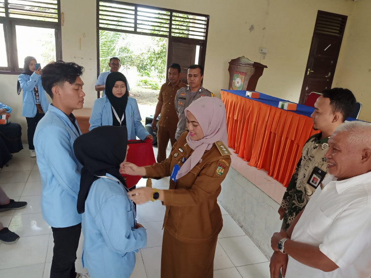 Camat Kampar Utara Riska Jonita Eka Putri, S.STP, M.Si sematkan Pin secara simbolis tanda kepersetaan KKN Universitas Riau